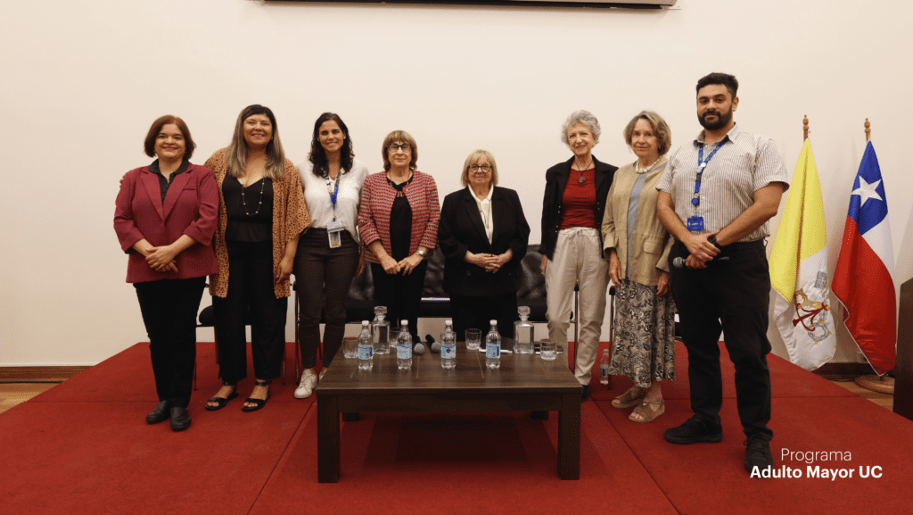 La jornada también incluyó un panel de conversación que reunió distintas miradas vinculadas al trabajo con personas mayores. En esta instancia participaron Alonso Calderón, cientista político y coordinador del Programa 60+ Digital; Margarita Errázuriz, fundadora del Ciclo de Espiritualidad del Programa Adulto Mayor UC; Cecilia Marticorena, estudiante de los cursos del programa e integrante del Comité Asesor de Personas Mayores; María Fernanda Calvo, kinesióloga UC, docente y líder del programa Camina 60+; junto a la propia Montserrat Amorós como experta invitada.